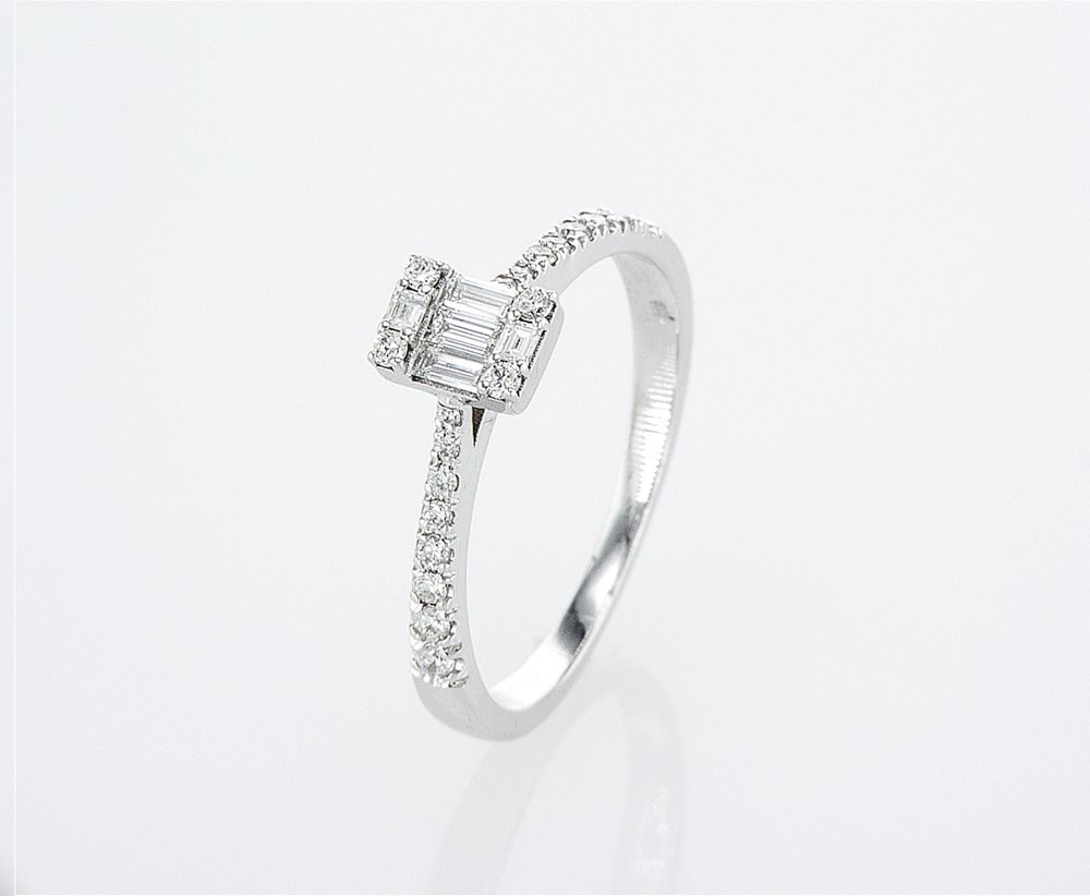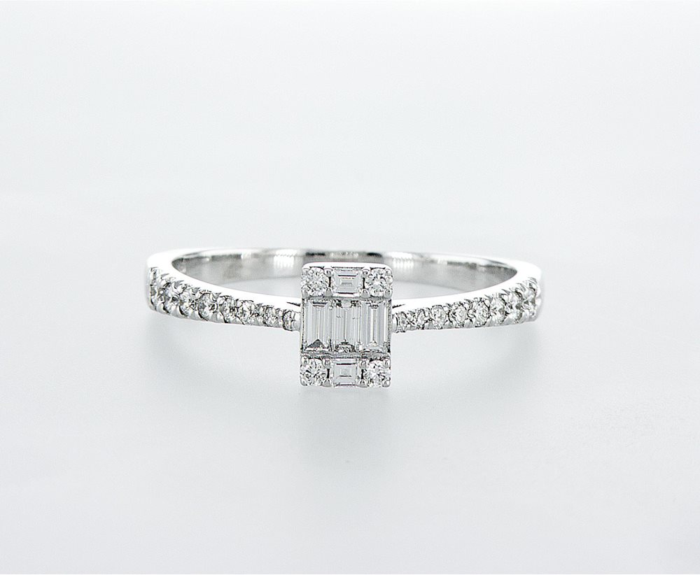 טבעת אלגנטית ומהודרת המעוצבת מיהלומים מסוג "בגטים" ויהלומים עגולים, במשקל כולל של 0.40 נקודות באיכות