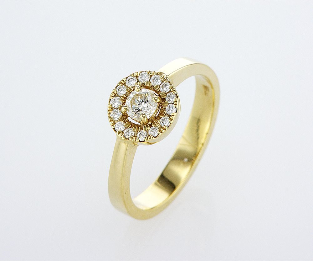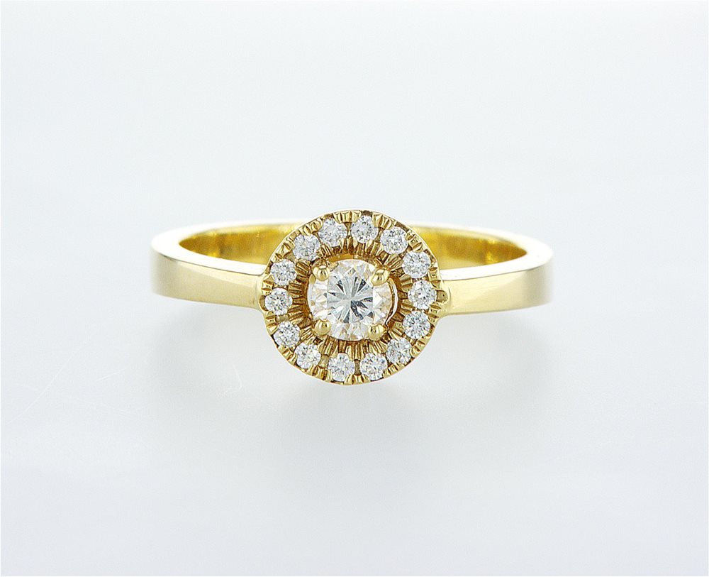 טבעת זהב 14 קארט משובצת יהלום מרכזי במשקל 0.25 נקודות באיכות D-F-/VS בתוספת יהלומים סביב המרכזית במשקל 0.14 נקודות באיכות D-F/VS.