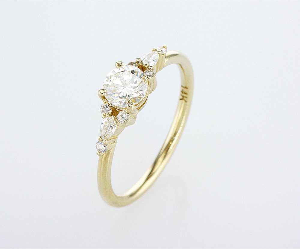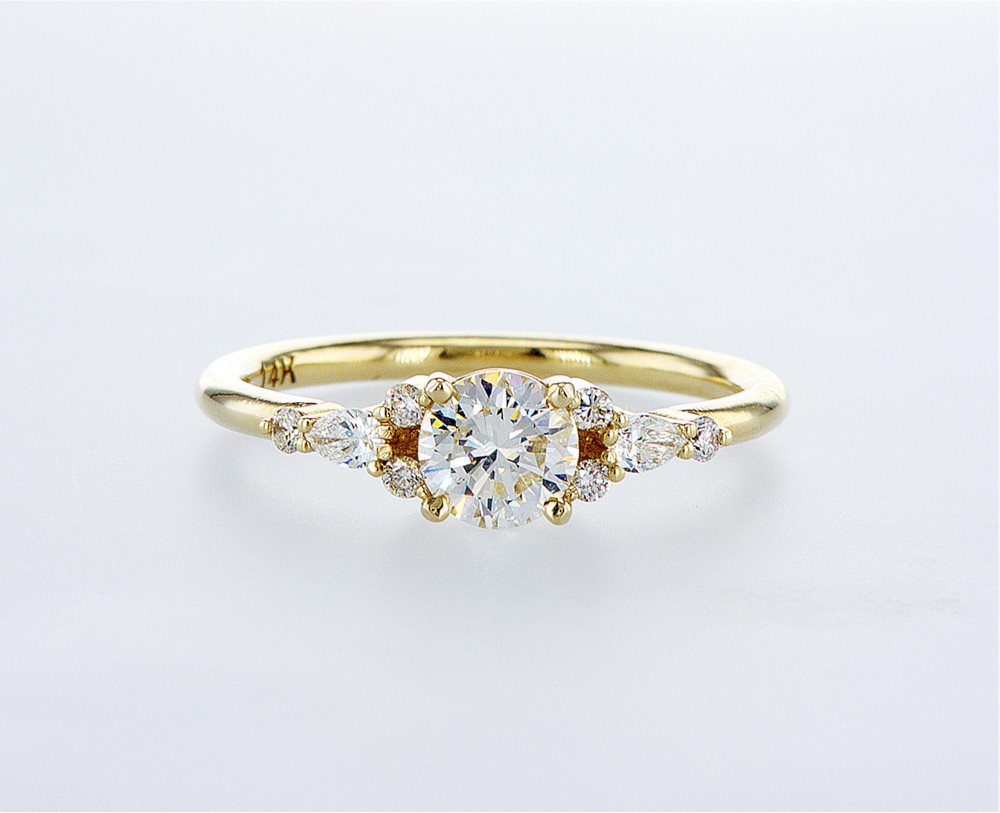 טבעת מעוצבת ומיוחדת המשלבת יהלומי צד בצורת טיפות למראה מיוחד ויוקרתי.