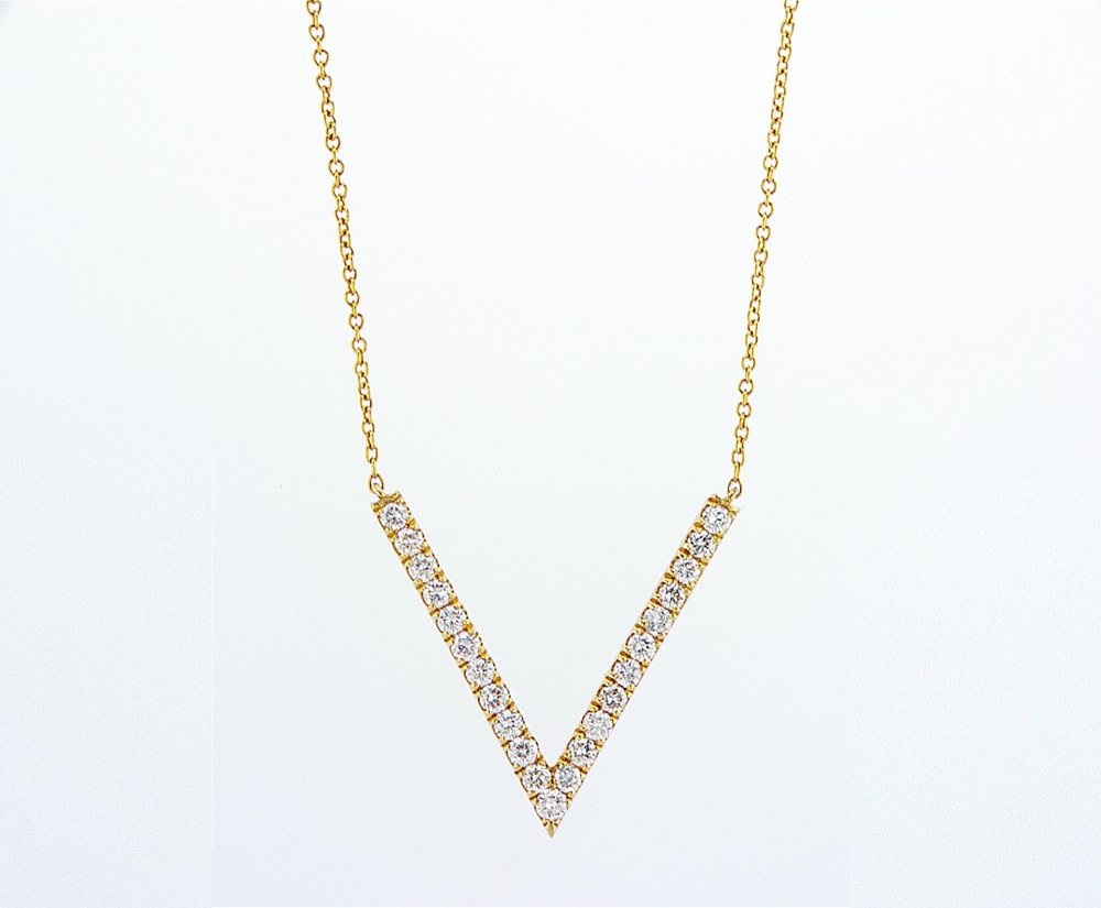שרשרת זהב 14 קארט עם תליון וי משובץ יהלומים טבעיים במשקל 0.35 נקודות באיכות D-F/VS.