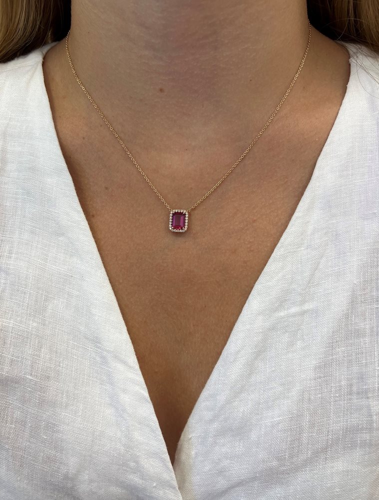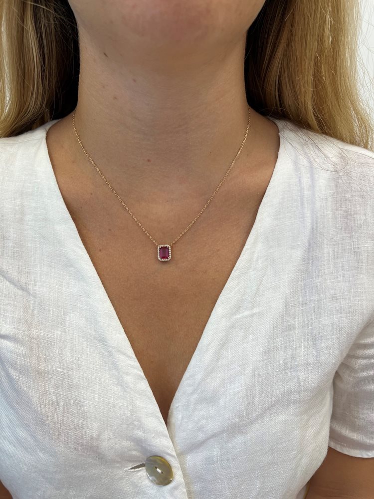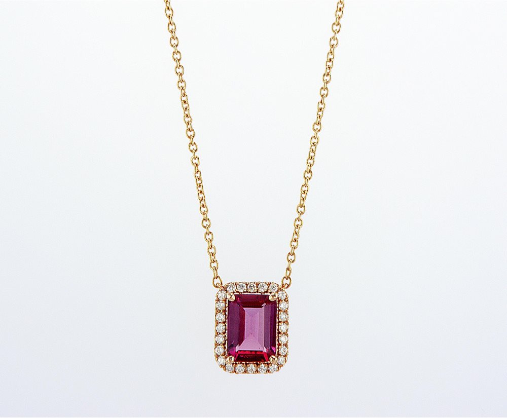 שרשרת זהב 14 קארט עם אבן חן טורמלין משובץ סביבו יהלומים טבעיים במשקל 0.24 נקודות באיכות D-F/VS.