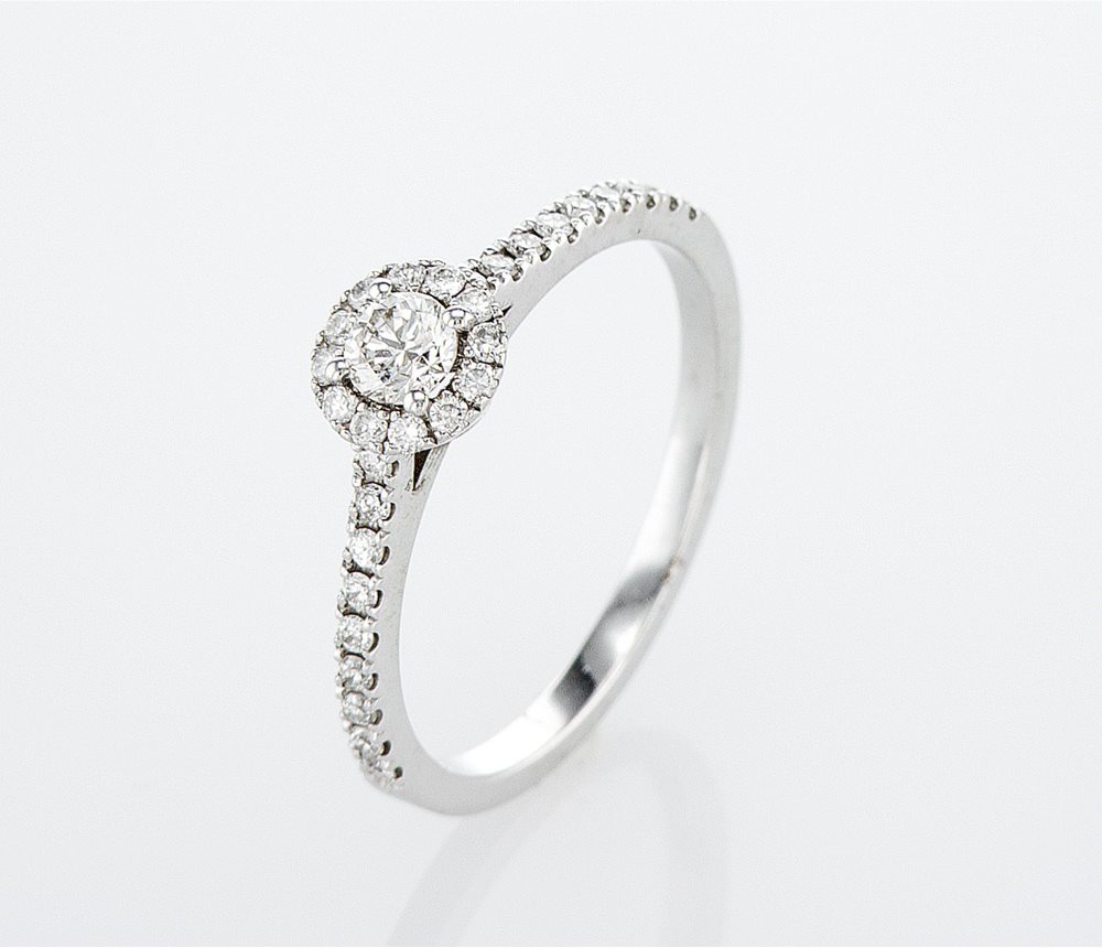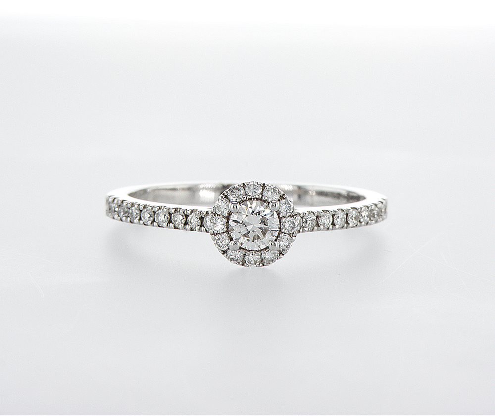 טבעת אירוסין קלאסית משובצת יהלום מרכזי במשקל 0.20 נקודות באיכות F\VS, בתוספת יהלומים סביב היהלום המרכזי ובצידי הטבעת במשקל 0.30 נקודות באיכות D-F\VS.