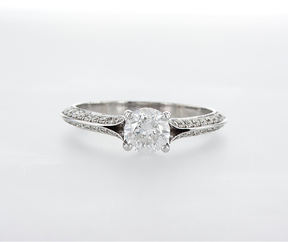 טבעת אירוסין משובצת יהלום מרכזי במשקל 0.65 נקודות באיכות F\VS, בתוספת יהלומים טבעיים מתחת ליהלום המרכזי ובשני צידי הטבעת במשקל 0.25 נקודות באיכות
