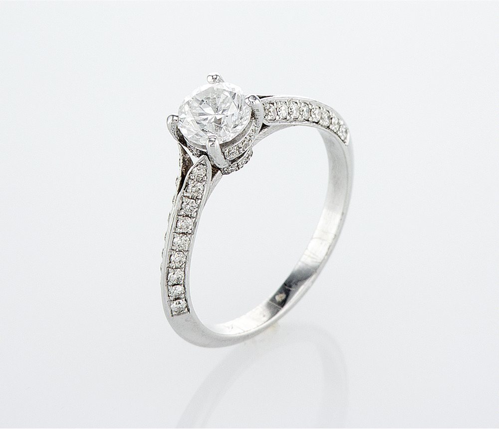 טבעת אירוסין משובצת יהלומים בשני צידי הטבעת ומתחת ליהלום