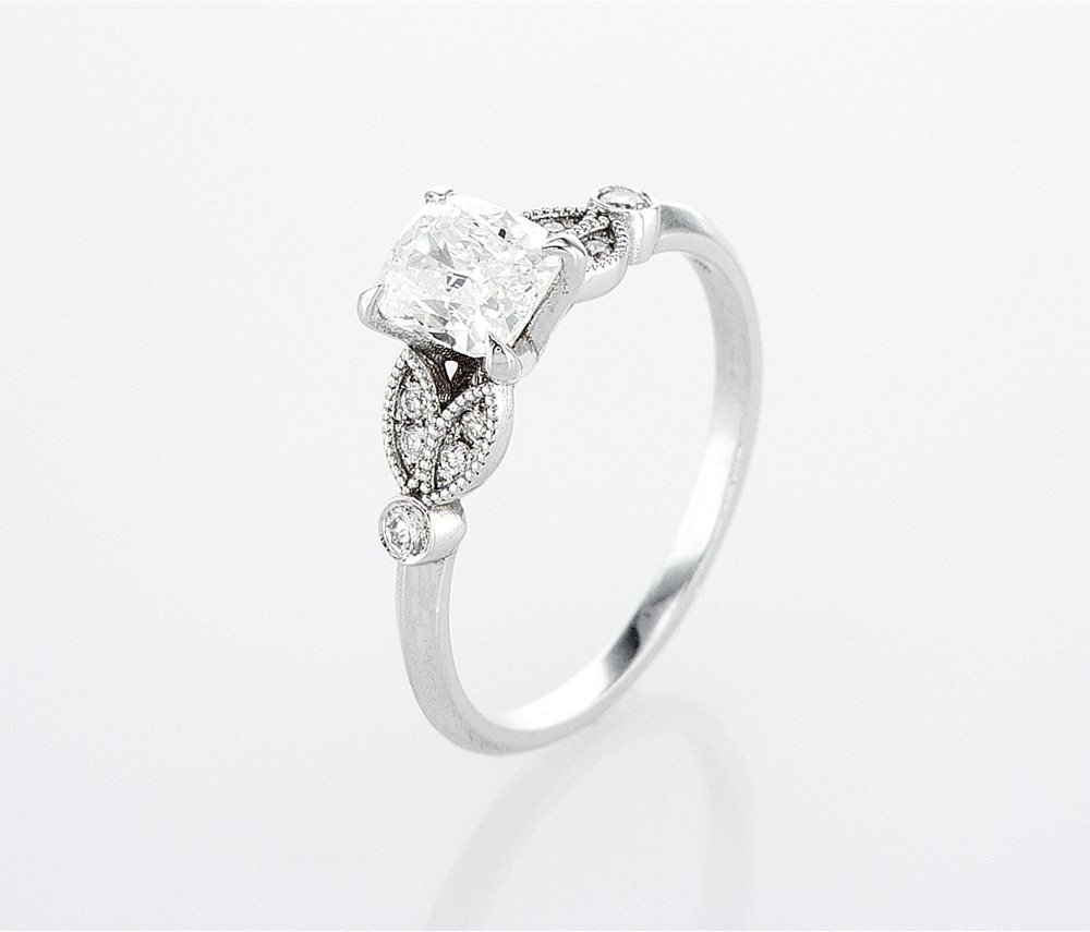 טבעת יהלומים בסגנון "וינטג" משובצת יהלום מרכזי טבעי בחיתוך קושן במשקל 0.90 קארט באיכות F\VS,