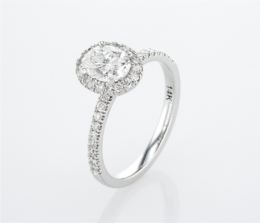 טבעת יהלומים משובצת יהלום מרכזי טבעי בחיתוך אובל במשקל 1.00 קארט באיכות F\VS, בתוספת יהלומי מסביב למרכזית ובצידי הטבעת במשקל 0.40 נקודות באיכות D-F\VS.