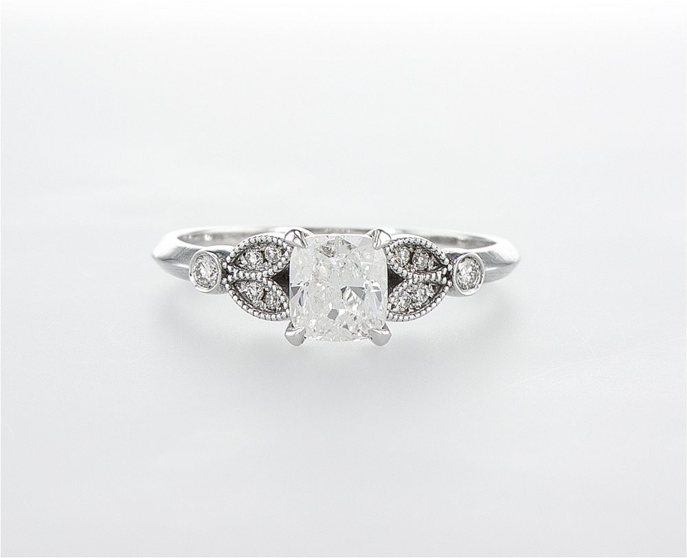 טבעת יהלומים בסגנון "וינטג" משובצת יהלום מרכזי טבעי בחיתוך קושן במשקל 0.90 קארט באיכות F\VS,