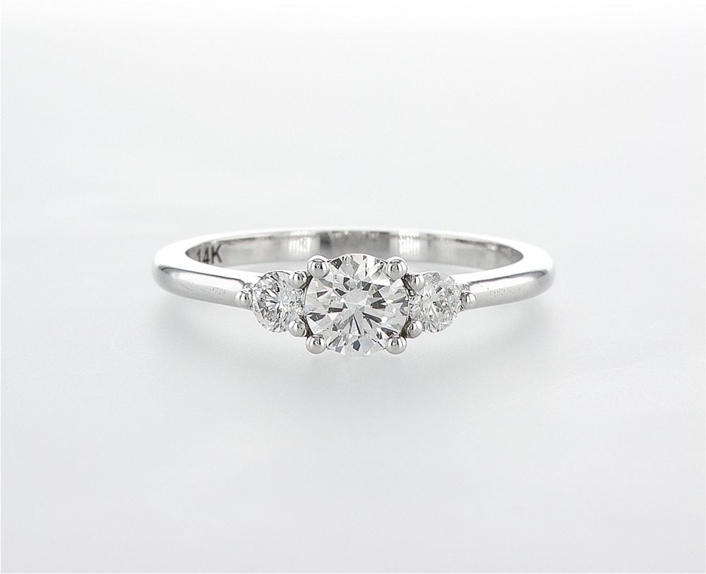 טבעת אירוסין שמורכבת משלושה יהלומים, משובצת יהלום מרכזי טבעי במשקל 0.56 נקודות באיכות F\VS, בתוספת שני יהלומי צד במשקל של 0.30 נקודות באיכות D-F\VS.