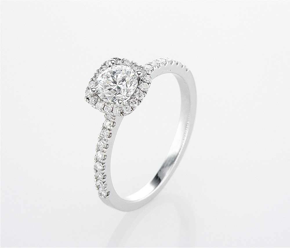 טבעת אירוסין משובצת יהלומי צד ויהלומים סביב היהלום המרכזי