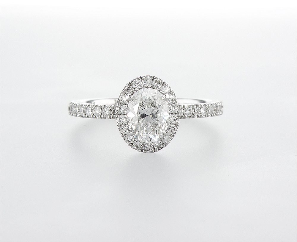 טבעת יהלומים משובצת יהלום מרכזי טבעי בחיתוך אובל במשקל 1.00 קארט באיכות F\VS, בתוספת יהלומי מסביב למרכזית ובצידי הטבעת במשקל 0.40 נקודות באיכות D-F\VS.